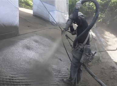 モルタル・コンクリート吹付工は、吹付機にセメントや骨材(砂・砕石)清水を投入して攪拌し、コンプレッサーによる圧縮空気で法面に吹き付ける法面保護工です。
